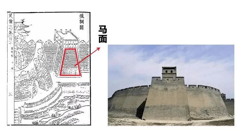 马面一词作为服装出现,最早是在《明宫史》中:曳撒,其制后襟不断,而两傍有摆,前襟两截,而下有马面褶,往两旁起。马面裙的马面并不是因为像马的面形所以才叫马面裙,这里「马面」其实是建筑上的词汇,古时候的敌台,又称马面,是在城墙或城池旁突出的塔楼式建筑,在正面或两面突出城墙外,其主要功能是加强防御与攻击墙底敌军。这种裙的裙门与马面构造相仿,所以为了区别于其他款式的裙子,就称为马面裙。