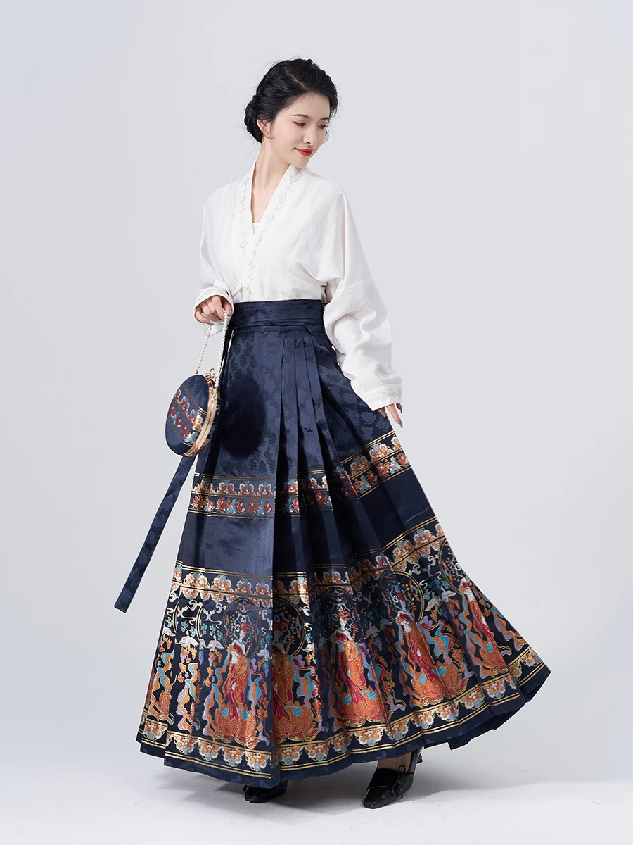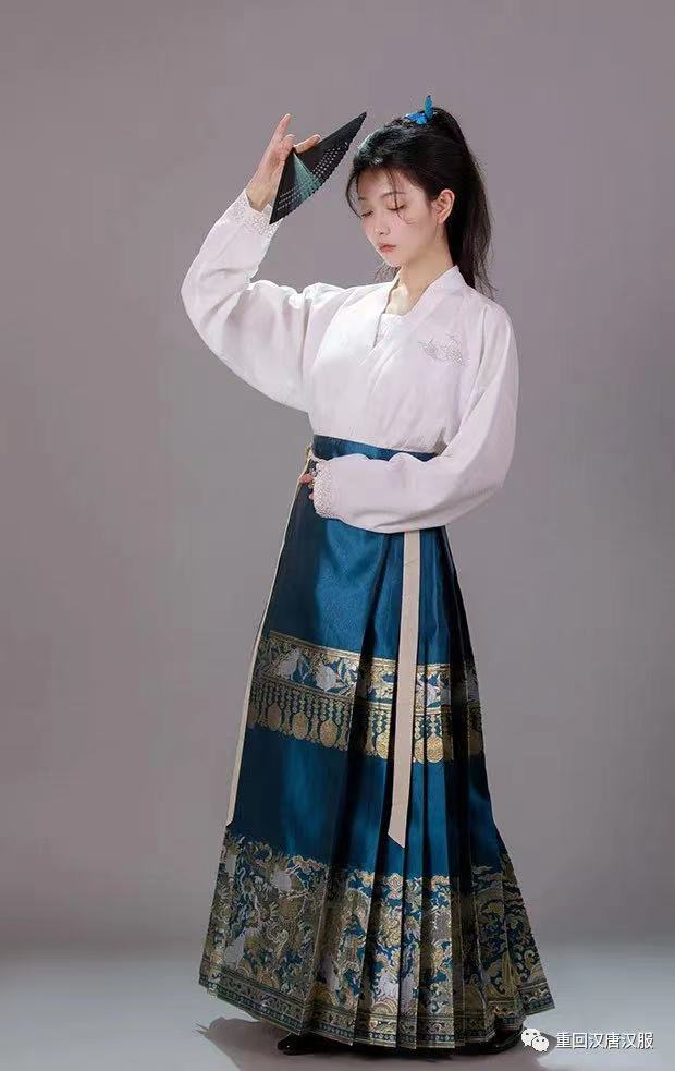 纹案精美的马面裙搭配交领右衽的上衣,这种穿搭在如今的汉服文化中也十分常见: