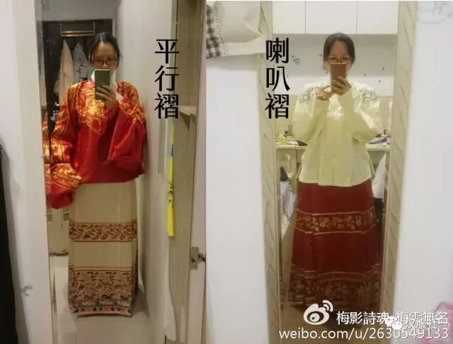 妹子買馬面裙最擔心炸褶問題,腰臀差20公分的我,我買過五家的馬面裙,就只有一家炸翻天,所以萬一炸褶了,回頭找裁縫去吧。這邊想講的是平行褶與喇叭褶(也有人稱梯形褶)的問題。