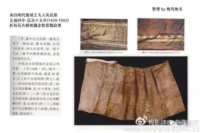之後用的面料逐漸增加,像是弘治年間寧靖王夫人的裙子,有兩條都明白寫了,單片用三幅半織物拼成,總寬210公分左右,全裙用布量大概是4.2米。而定陵也有出土用三幅半拼成的裙子。