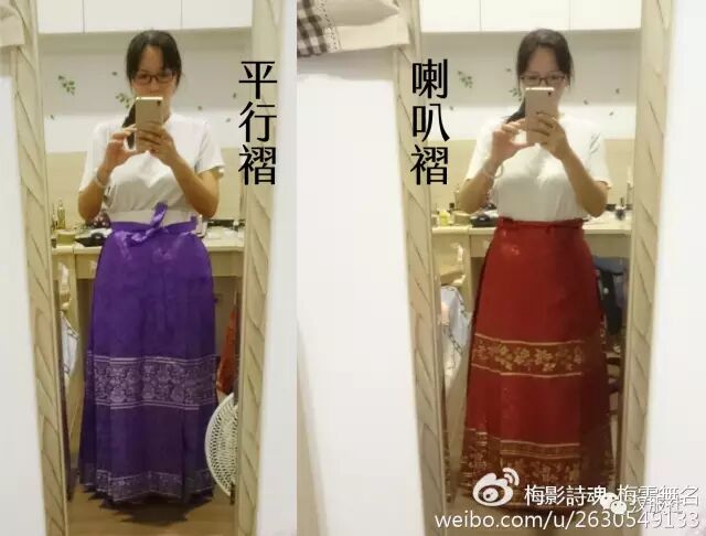 馬面裙的褶子打法有兩種,一種是上下等寬的平行褶,一種是上窄下寬的喇叭褶。紫色那件裙子,就是平行褶的做法,而藍色這件,則是喇叭褶。吾友無劫緣(帖吧ID:絲雨晨光)認為: