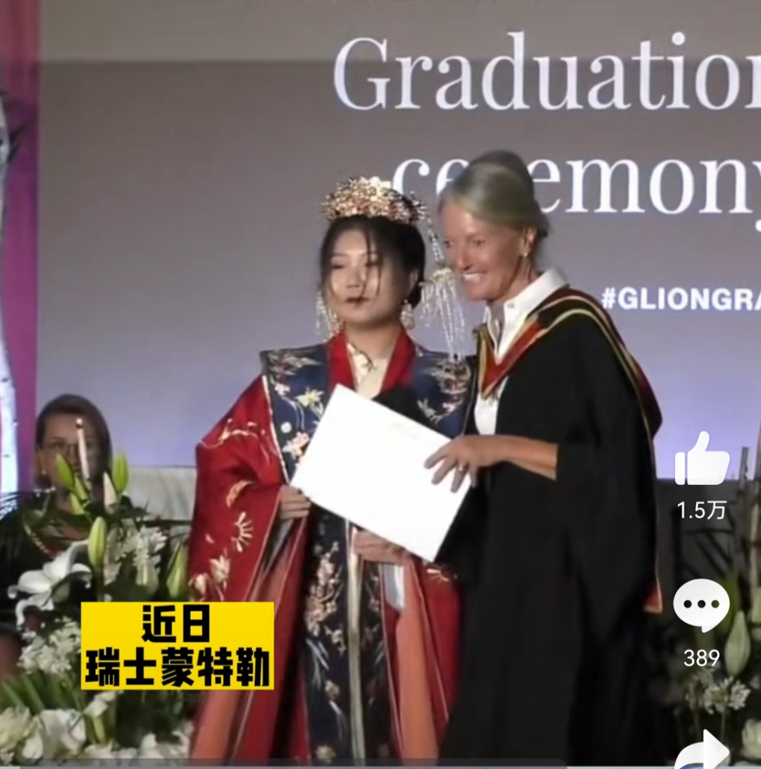 近日,在瑞士蒙特勒,一名中国女留学生穿着明制汉服马面裙参加硕士毕业典礼,并且在结束时还向院长及教授介绍汉服的礼仪和文化,大写的中国传统文化输出!