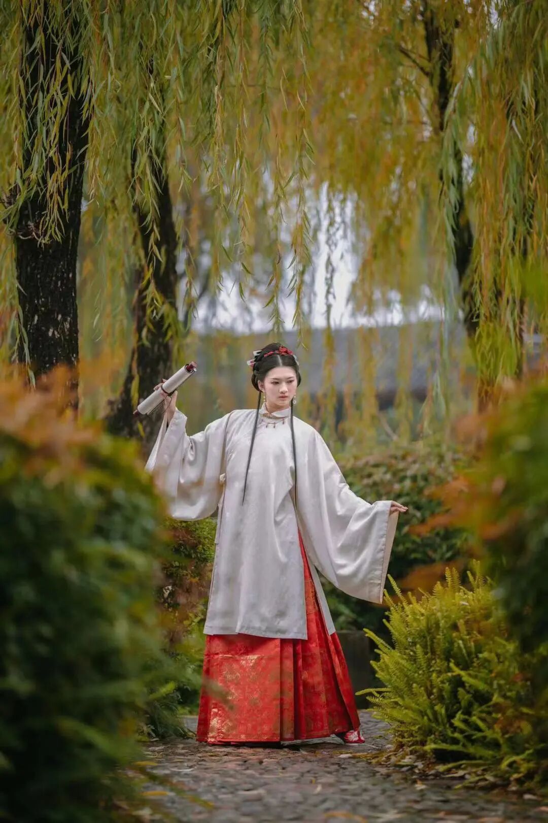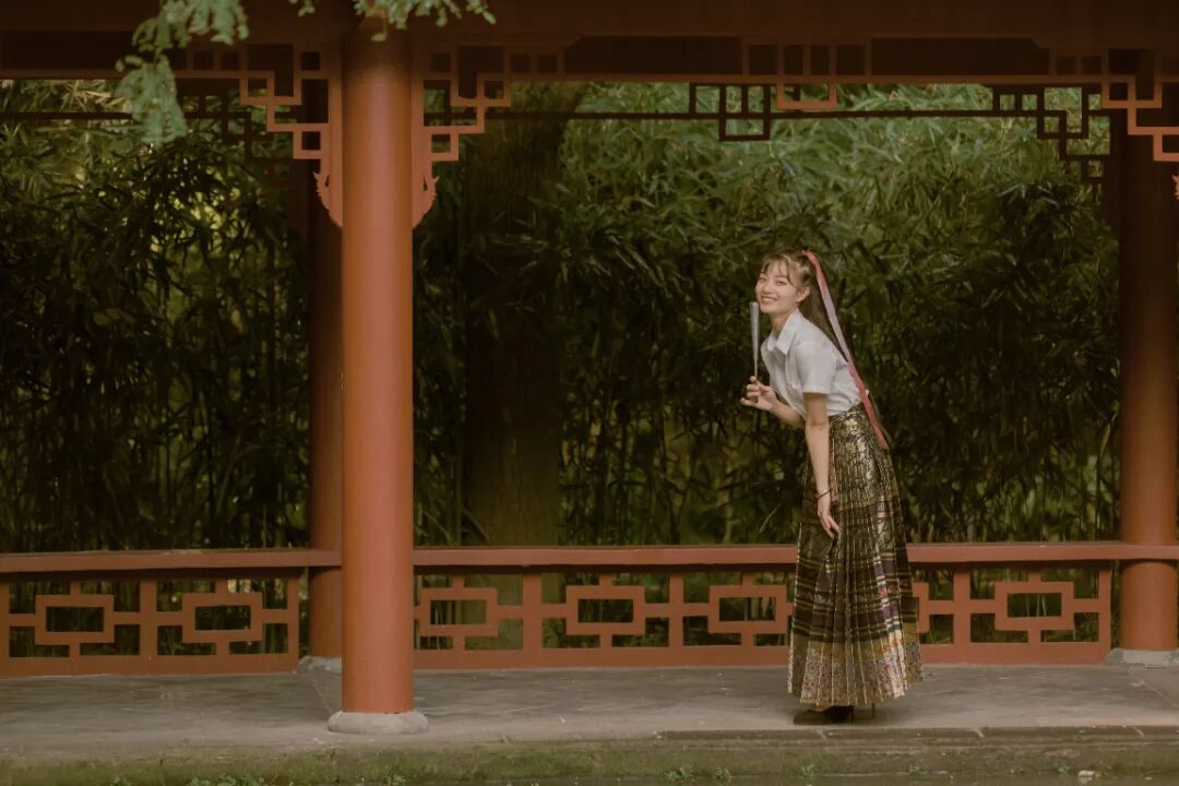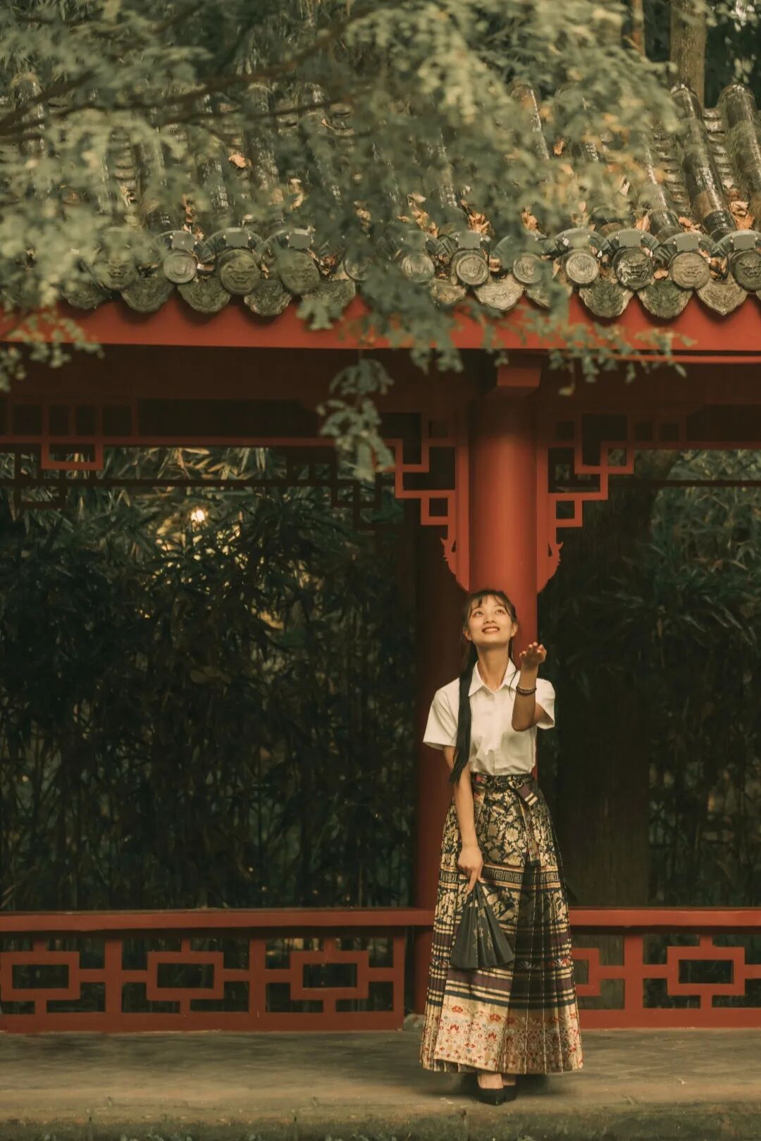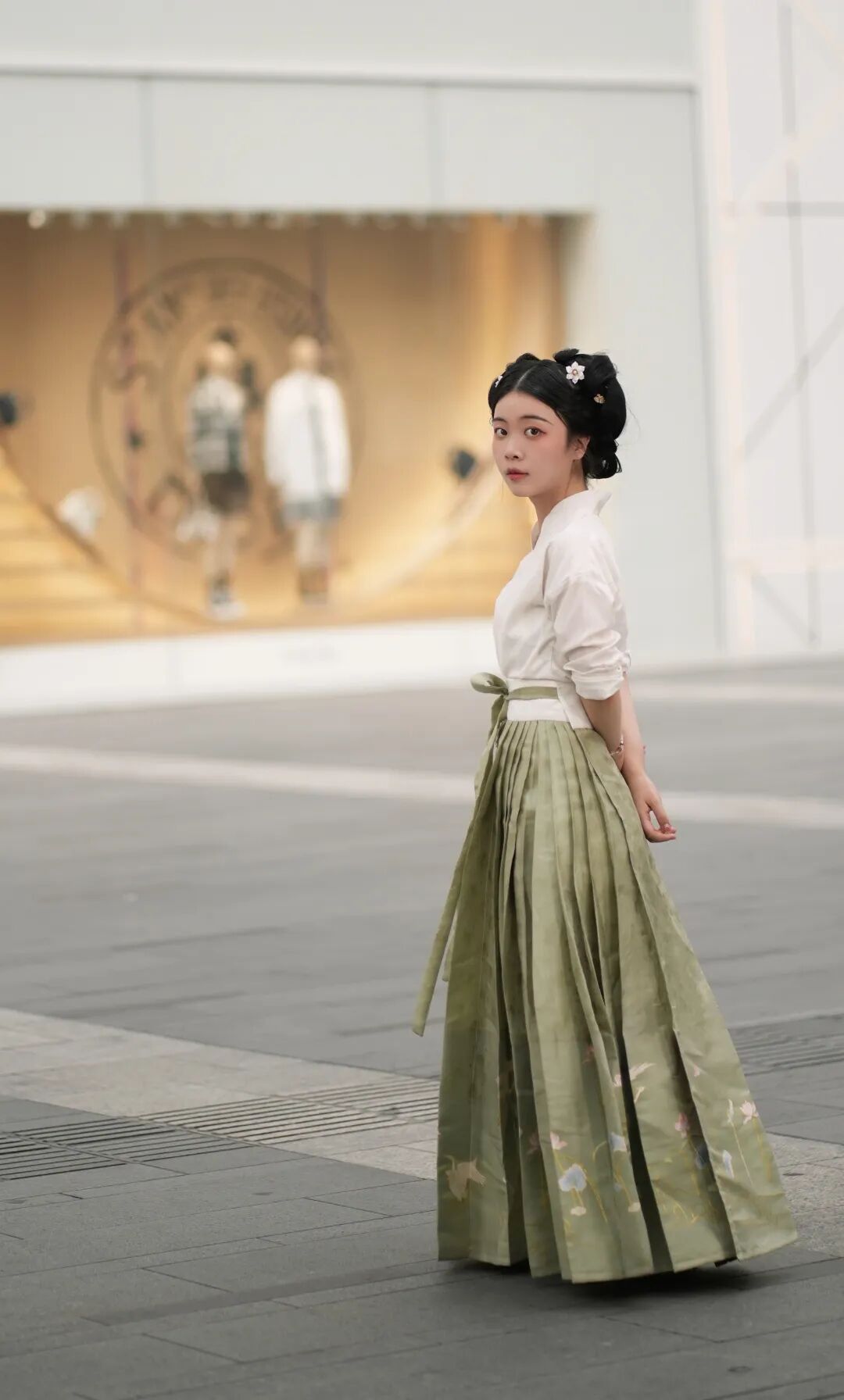 马面裙属于汉服体系中的一种非常有特色的裙装,诞生凝聚着先人的杰出智慧,也能看出历史演变的痕迹。在古代,人们往往用面料花色去命名,比如蜜合色纱挑线穿花凤缕金拖泥裙。我们今天为了方便,统一称作马面裙。