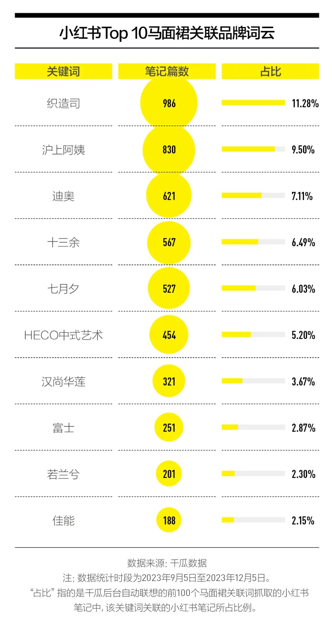 其他汉服品牌也不会放弃马面裙这个机会。汉服品牌十三余在淘宝平台马面裙品类里也销量靠前,品牌创始人本身就是汉服圈的博主,2016 年她创办了十三余,至今推出过多款匹配马面裙的汉服套装,如今品牌年销售额超过 3 亿元。