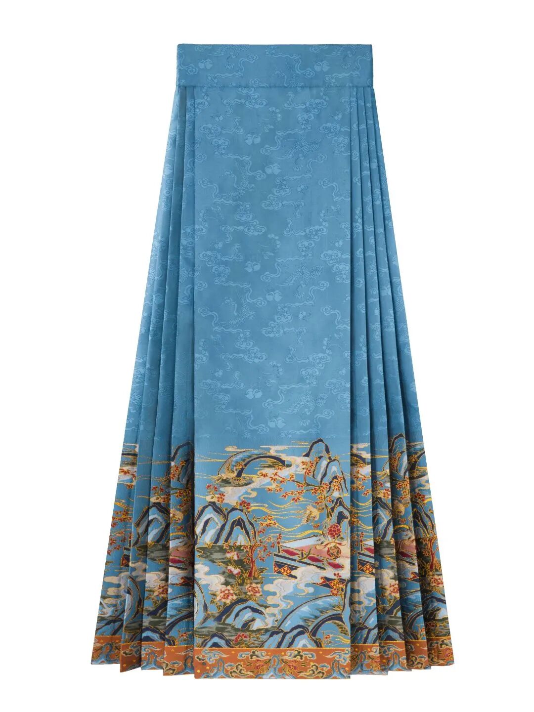 ●没有褶皱、正对着前方的光滑裙门就是马面,两侧打褶的为裙裾。这是马面裙的基本结构。中国传统美学元素,如植物、鸟兽、山景、园林、祥云,都可能成为马面裙的设计灵感。图片来源 | 织造司